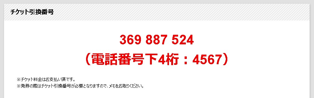 - お支払・発券するには「チケット引換番号(9桁)」とご登録の「電話番号(下4桁)」が必要です。