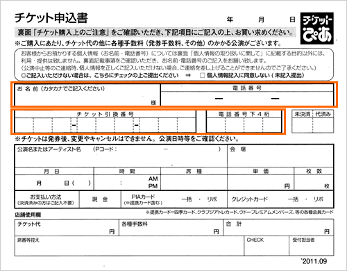 店頭のチケット申込書に「チケット引換番号(9桁)」と「電話番号(下4桁)」をご記入の上、店舗スタッフに渡します。