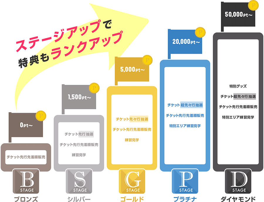 タカポイントを貯めれば貯めるほど、ステージランクが上がります!! ステージは全部で5段階。タカチケットではステージに合わせてチケットが早く購入できます。