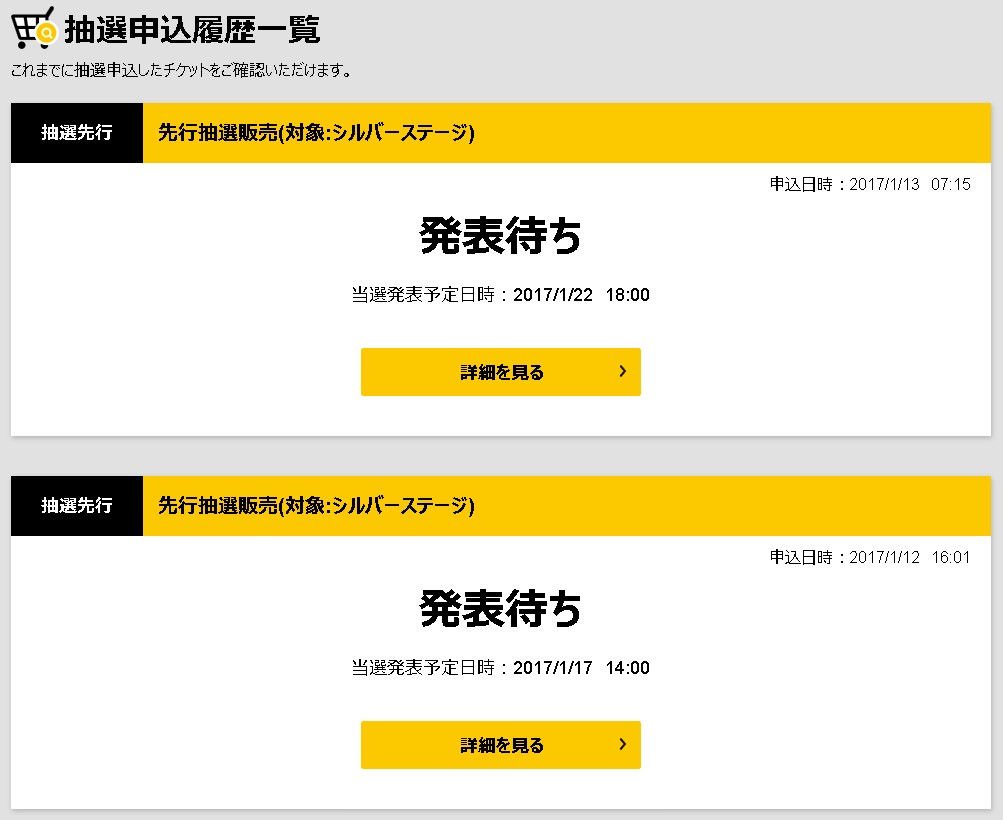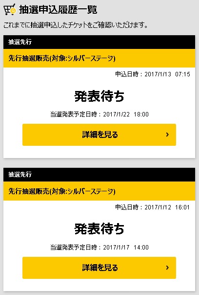 申込履歴の一覧が表示され、抽選販売別の申込状況や抽選結果などを確認することができます。「詳細を見る」をクリックすると。申し込んだチケットの内容や金額を確認することができます。