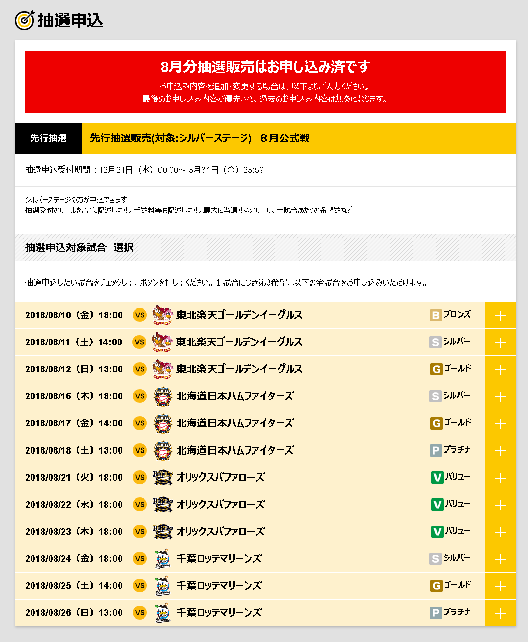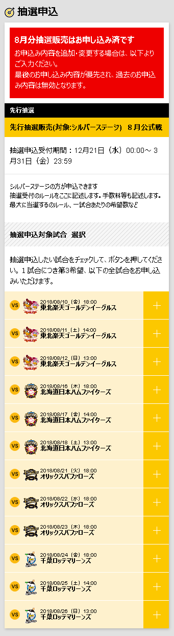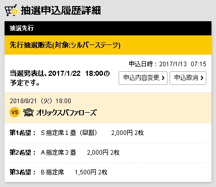 申込内容を変更する場合は、ご希望の試合日・席種・枚数を再度選んでお申込みください。受付終了1時間前以降の変更はできませんのでご注意ください。