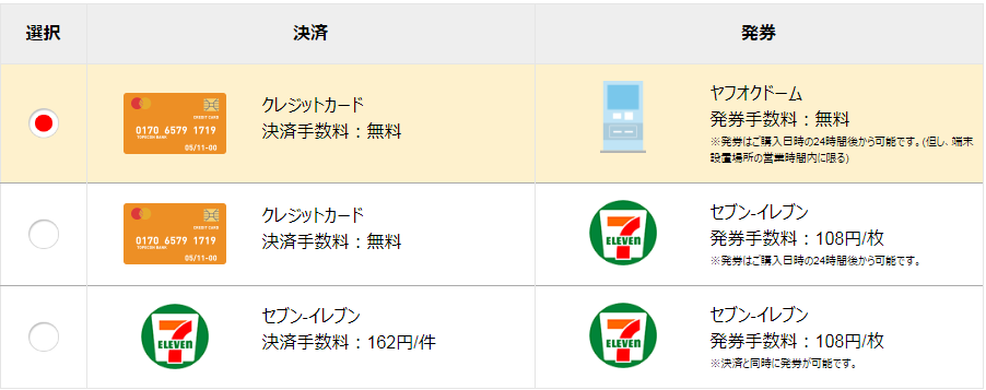 ヤフオクドームで会場発券機で発券するには、「引取方法選択画面」で「ヤフオクドームで発券」を選択してください。